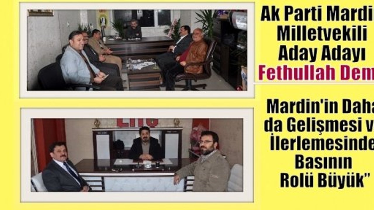Basın temsilcileri de Ak parti Mardin Milletvekili Aday adayı Fethullah Demir’ın kendilerine yaptığı ziyaretten son derece memnun olduklarını ifade ederek seçim çalışmalarında başarılar dilediler.
