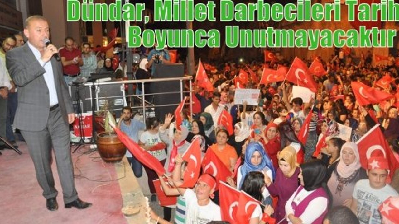 İl Başkanı Dündar, “Hain darbe girişiminin başladığı anlardan itibaren tüm teşkilatlarımızı uyararak parti önüne gelmelerini ve derhal sokağa çıkmalarını söyledik. Ve böylece halkımızla beraber hain güruhlara karşı mücadelemizi anında başlatmış olduk. Halkımız büyük bir dik duruş örneği sergileyerek sabaha kadar sürecek olan bir nöbetin kapısını aralamış oldular. Zaten ardından Cumhurbaşkanımız Sayın Recep Tayyip Erdoğan’ın çağrılarıyla bu nöbetlerimizi 27 gün boyunca sürdürdük. O gece vatandaşlarımız ülkemizin çeşitli yerlerinde hain darbeciler tarafından şehit edildiler, yaralandılar. Onların o asil kanları bu toprakları kurtarmaya yetti. Geçmişte nasıl ki Kurtuluş Savaşında, Çanakkalle Zaferinde halkımızın tertemiz kanı galip gelmişse, 15 Temmuz gecesi de aynı yiğitlerin zaferi oldu. Onlara minnet borçluyuz. Allah ruhlarını şad etsin, mekânları cennet olsun. Gazilerimize de bir kez daha Allah’tan acil şifalar diliyorum”.