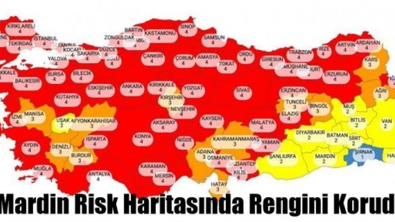 Tüm uyarılara rağmen son dönemde vaka sayısının artmasıyla birlikte yeni açıklanan risk haritasında turuncu renkte bulunan illerin kırmızıya döndüğü görülürken çok yüksek risk grubunda bulunan il sayısı 58’e yükseldi. Düşük risk kategorisinde sadece Şırnak ili Mavi renkte kalırken aralarında Mardin’inde bulunduğu 10 il sarı renk grubundaki orta riskli kategoride yer aldı. Turuncu renkteki illerin kırmızıya dönüşmesiyle birlikte bu renkteki 12 il yüksek risk grubunda, 58 il ise kırmızı rennk grubunda çok yüksek il kategorisinde yer aldı.
