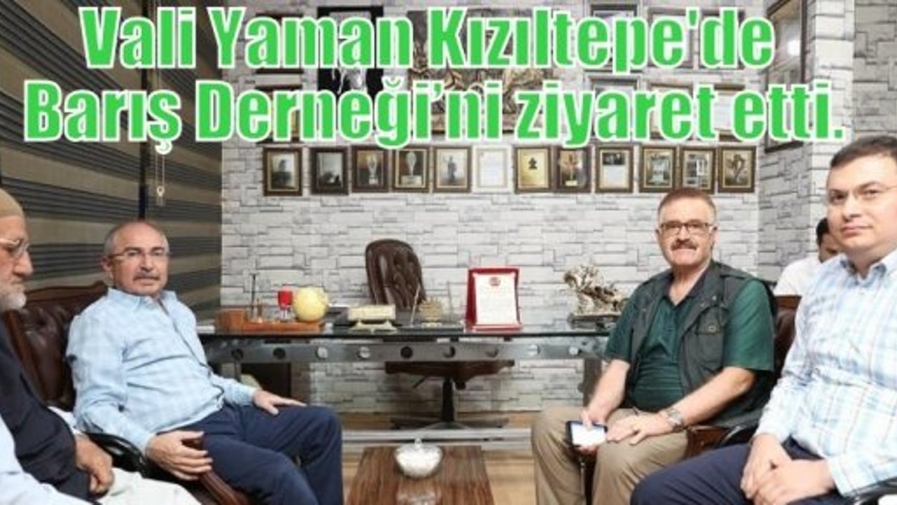 Vali Mustafa yaman heyetini, Barış Derneği Başkanı Cemil Aydoğan,Başkan yardımcısı Mehmet Şerif Öter, Sayman Abdüllatif Nakşioğlu, Kızıltepe Gazeteciler Derneği Başkanı Faraç Çobanoğlu karşıladı. Vali Yaman ziyarette Barış Derneğine hayırlı olsun temennisinde bulundu.